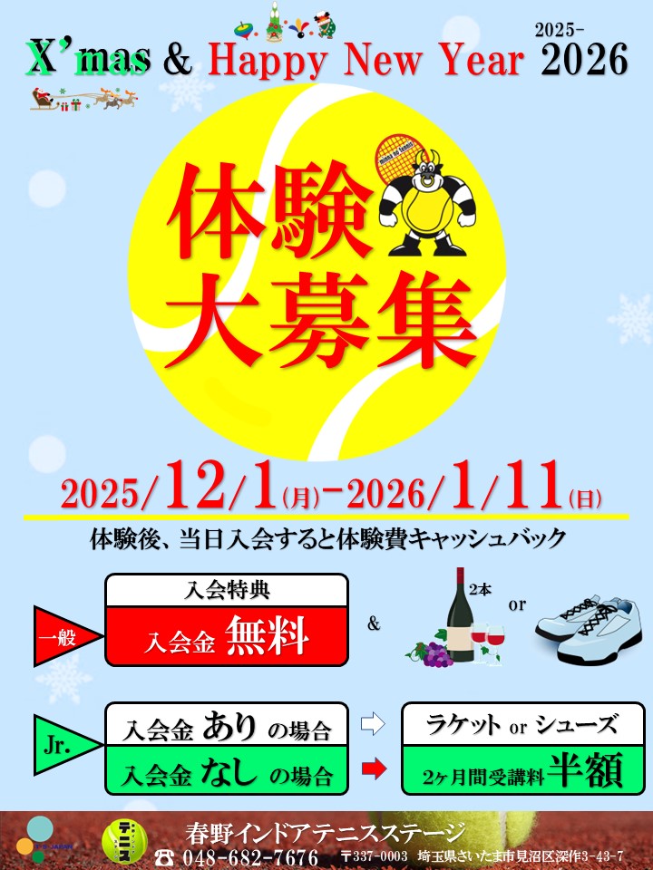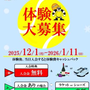 入会キャンペーン【12/1(月)~1/11(日)】開催いたします!! 2025.11.22 Tweet Share Hatena Pocket RSS feedly Pin it 上記期間にご入会の方には、お得な特典がいっぱ~い(*^_^*) テニススクールをお探しの皆様、是非ともこの機会お見逃し無く!! Tweet Share Hatena Pocket RSS feedly Pin it 11月期・週間レッスンスケジュール