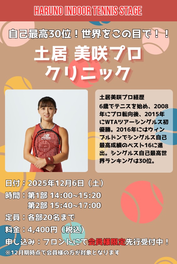 土居美咲プロ クリニック開催決定!! 2025.10.08 Tweet Share Hatena Pocket RSS feedly Pin it 1部・2部ともに、定員は20名ですので、参加ご希望の方は お早めにフロントまでお申込みください (*^_^*) Tweet Share Hatena Pocket RSS feedly Pin it Babolat アパレル SALE 45%OFF (10/1... レベル別 (外部) 体験会 11/2(日)・8(土)・16(...