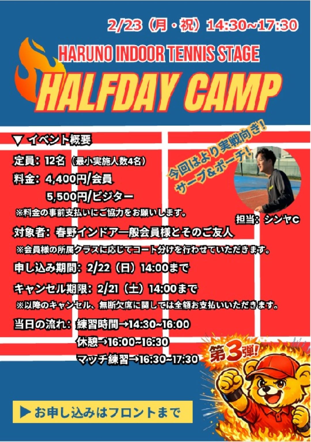 2月23日(月・祝)HALFDAY CAMP 開催のお知らせ 2026.02.16 Tweet Share Hatena Pocket RSS feedly Pin it Tweet Share Hatena Pocket RSS feedly Pin it ストリング&ラケットキャンペーン 1/12(月)~2/15(... 2/28(土) BabolaTラケット 試打会 参加者募集中...