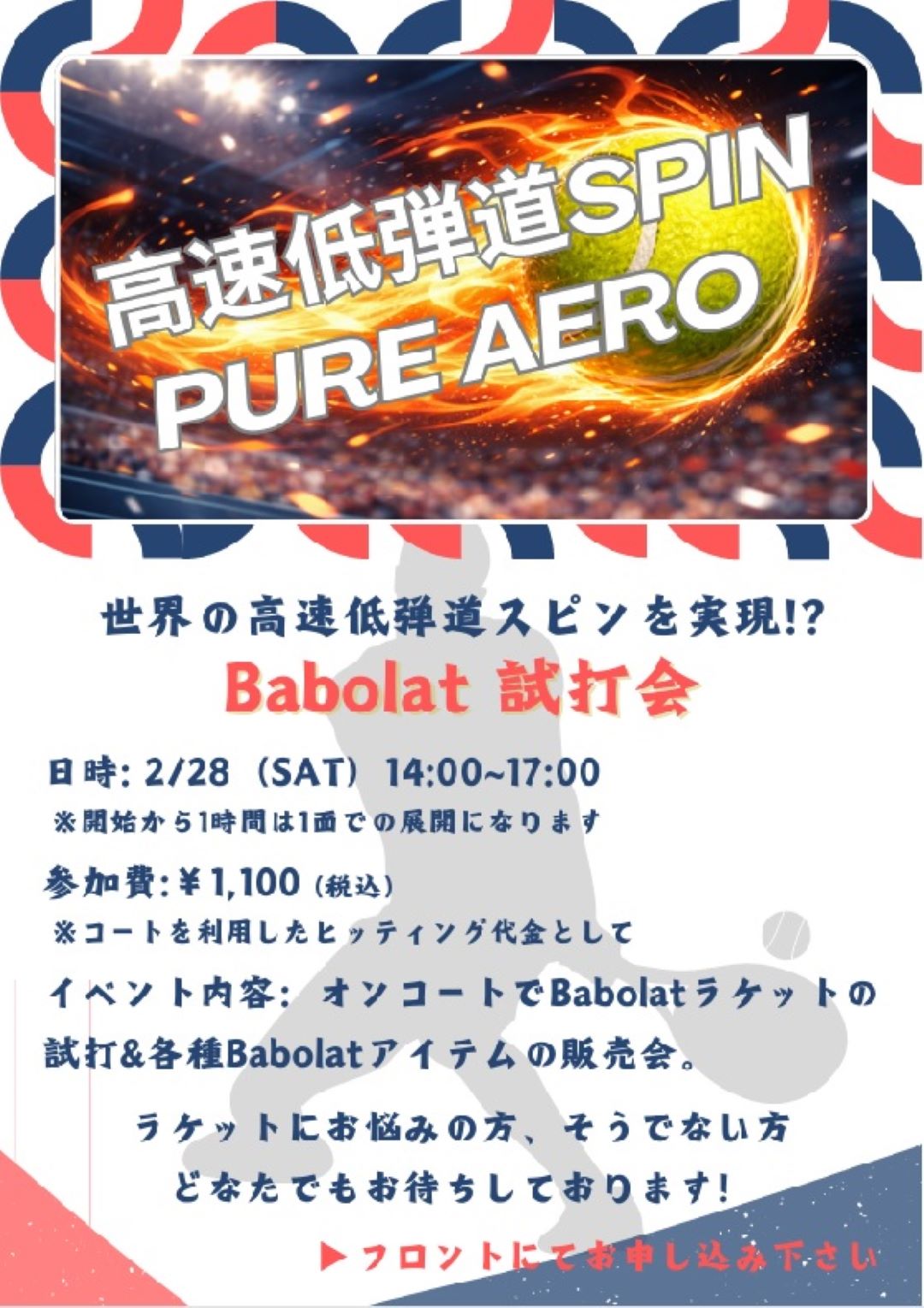 2/28(土) BabolaTラケット 試打会 参加者募集中!! 2026.02.17 Tweet Share Hatena Pocket RSS feedly Pin it 新PURE AERO試打会&各種BabolaTアイテムの販売会のお知らせです。 そろそろ、ラケットを買い換えようかな・・・など、お考えの方や BabolaTのラケットが気になっている皆様、お待ちしております! (当日、ラケットご予約いただいた方には、参加費1100円のキャッシュバックあります) Tweet Share Hatena Pocket RSS feedly Pin it 2月23日(月・祝)HALFDAY CAMP 開催のお知らせ 親子体験会 3/7(土)・8(日) 参加者募集中!!