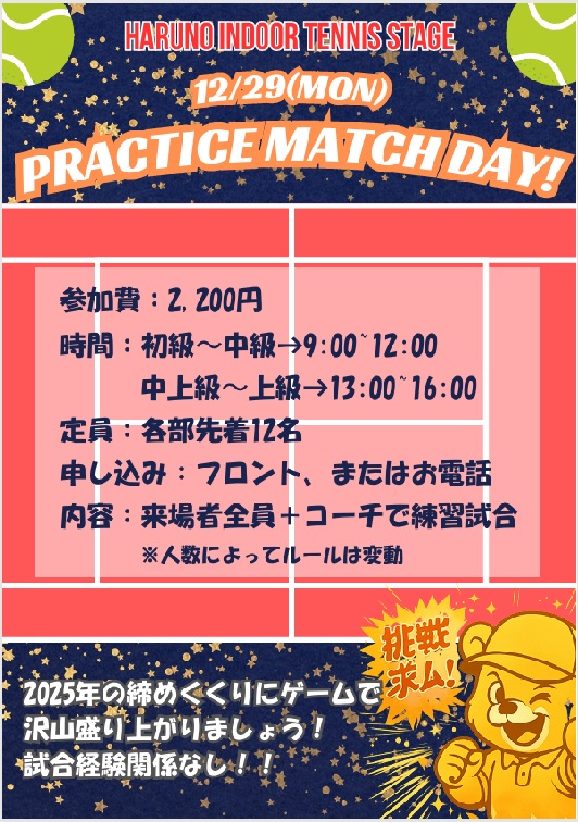 2025年 12月29日(月) ゲーム練習会 参加者募集中!! 2025.12.20 Tweet Share Hatena Pocket RSS feedly Pin it 年末はゲーム練習会で楽しもう!! ・日時:12/29(月) 午前の部( 初 級 ~ 中 級) 9:00~12:00 午後の部(中上級~ 上 級)13:00~16:00 ・定員:各部とも先着12名まで ・参加費:2,200円 ・ゲーム方式:参加人数によって変動いたします。 参加コーチは、吉井コーチ & 戸田コーチです(予定) ・お申し込み:フロントにて直接、または電話でお待ちしております(*^_^*) Tweet Share Hatena Pocket RSS feedly Pin it 入会キャンペーン【12/1(月)~1/11(日)】体験者大募... 2025年 12月30日(火) 忘年ラリー 参加者募集中!!