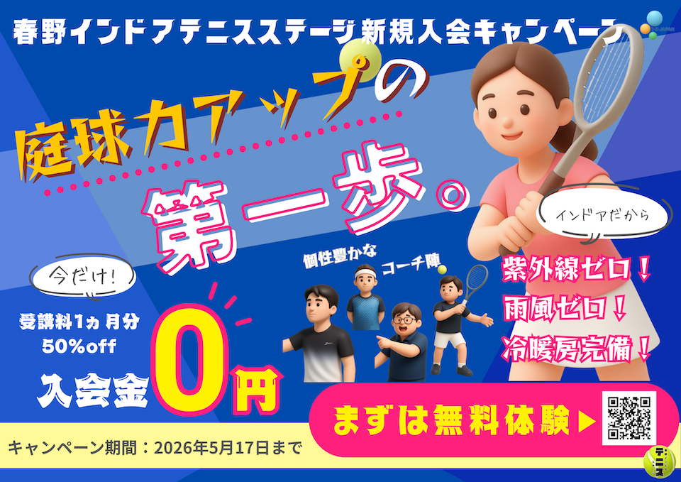 春の入会キャンペーン開催中!! (2026.4.1〜5.17) 2026.04.02 Tweet Share Hatena Pocket RSS feedly Pin it 春野インドアテニスステージ【春の新規入会キャンペーン】開催!! インドアだから「紫外線ゼロ!」「雨風ゼロ!」「冷暖房完備!」の春野インドアテニスステージで、個性豊かなコーチ陣と庭球力のアップの第一歩を踏み出しませんか?! WEB入会・体験入会 お問い合わせ Tweet Share Hatena Pocket RSS feedly Pin it 4月期・週間レッスンスケージュール
